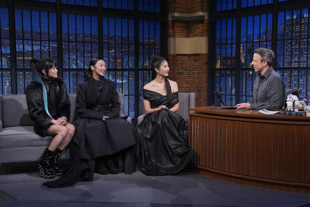 LATE NIGHT WITH SETH MEYERS — Episode 1738 — Pictured: (l-r) Singers Rei Ami, Audrey Nuna, and Ejae of “KPop Demon Hunters” during an interview with host Seth Meyers on Wednesday, November 26 2025 — (Photo by: Lloyd Bishop/NBC)