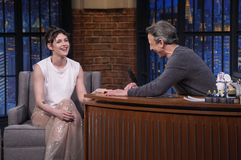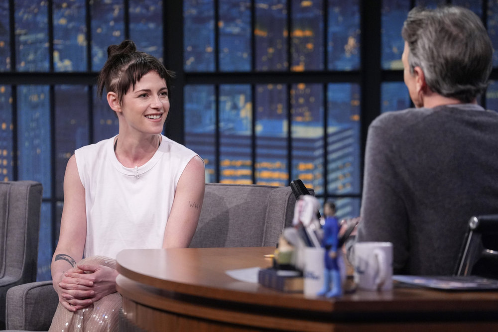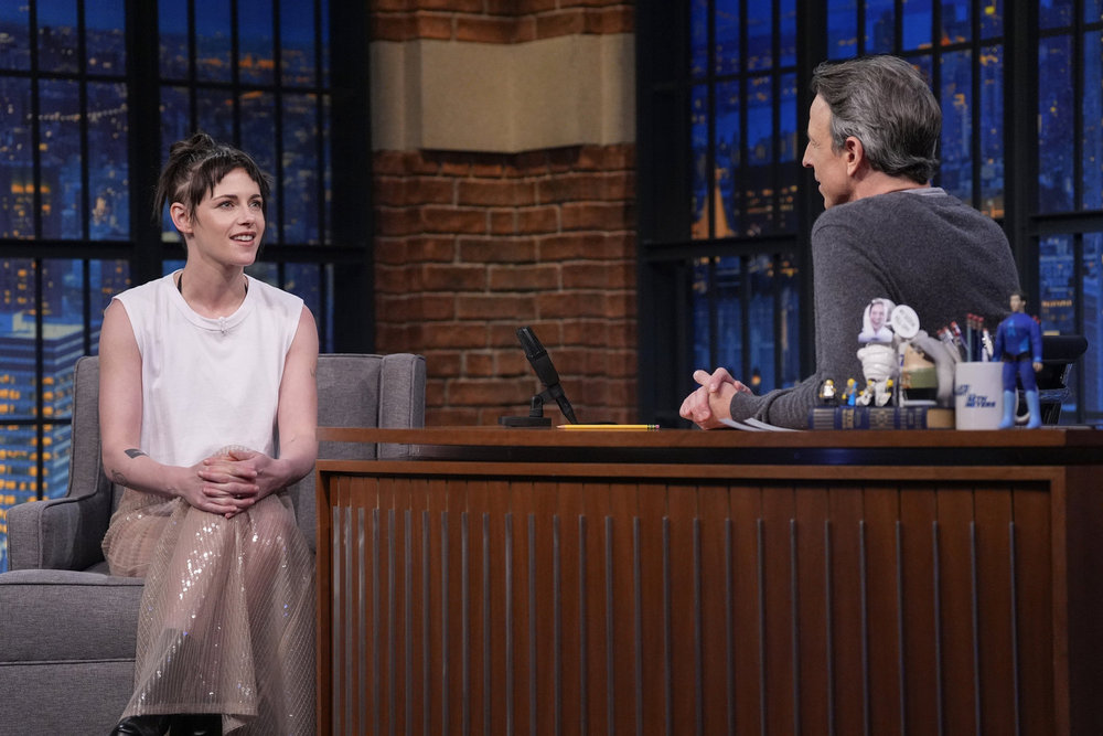 LATE NIGHT WITH SETH MEYERS -- Episode 1748 -- Pictured: (l-r) Actress Kristen Stewart during an interview with host Seth Meyers on January 5, 2026 -- (Photo by: Lloyd Bishop/NBC)