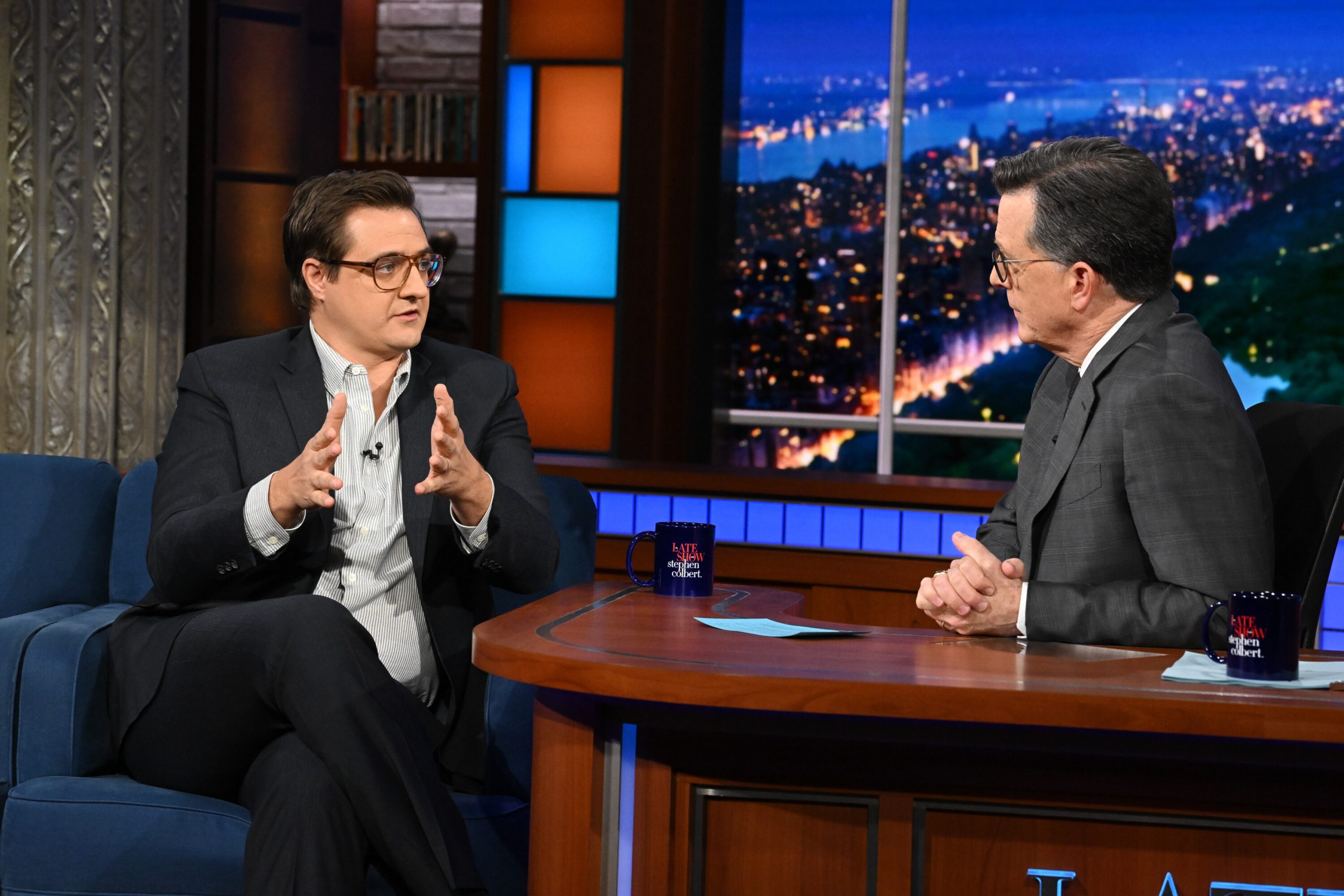 The Late Show with Stephen Colbert and guest Chris Hayes during Wednesday’s January 7, 2026 show. Photo: Scott Kowalchyk ©2026 CBS Broadcasting Inc. All Rights Reserved.