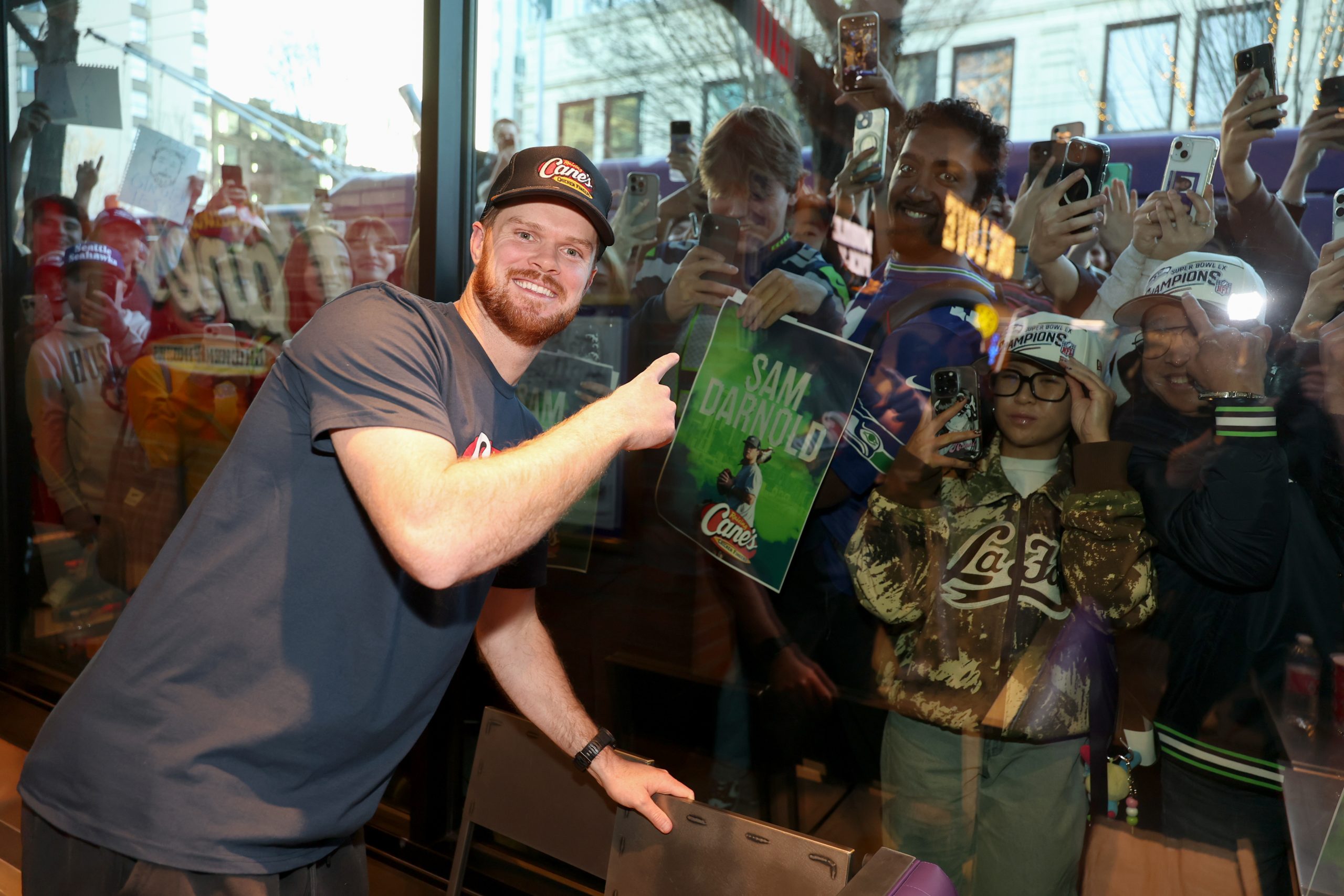 SEATTLE, WASHINGTON - FEBRUARY 10: Sam Darnold and fans attend Seahawks Quarterback Sam Darnold Works Celebratory Super Bowl "Shift" at First Raising Cane's in Seattle at Raising Cane’s on February 10, 2026 in Seattle, Washington. (Photo by Mat Hayward/Getty Images for Raising Cane's)